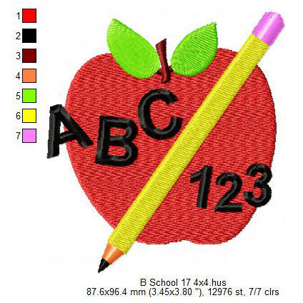 Apple Back To School ABC 123 Pencil Machine Embroidery Digitized Design Files